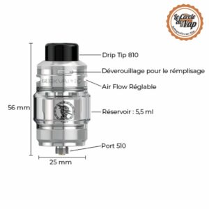 Système de flux d’air optimisé : géométrie top-to-bottom airflow + airflow réglable par le haut. Ce design limite fortement les fuites tout en assurant une très belle inhalation et de gros nuages.