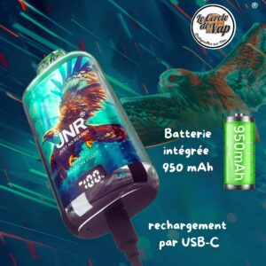 La puff JNR 28K est équipée d’une batterie de 950 mAh, rechargeable facilement grâce à son port USB-C situé à la base de l’appareil.